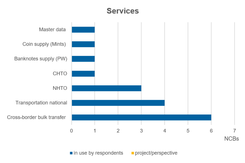 The ESCB Data Exchange for Cash Services (DECS) is a main driver for the use of GS1 Standards for Eurosystem NCBs. Consequently, the process of cross-border bulk transfers is used by most of the participating NCBs, followed by national transportation. Only one central banks offers CHTO and three central banks offer NHTO as a supply operation service, therefore the percentage in the chart is low.