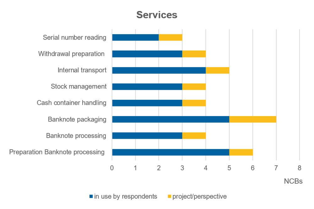 The chart shows that the benefits of GS1 standards come as well into effect at internal branch operations. Preparing banknote processing, banknote packaging and internal transport are mostly supported by GS1 standards. Some central banks report about project activities in this sector to integrate GS1 standards in their internal branch processes.